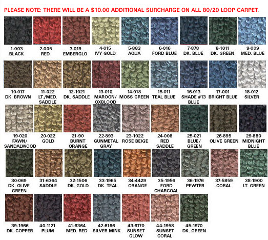 80/20 Schlingenware-Teppiche bestehen aus 80% Rayon und 20% Nylon. Sie wurden in den meisten US-Fahrzeugen ab 1973 und vor allem früher benutzt.