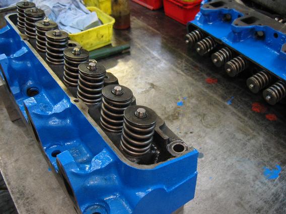 Nach der erfolgten Bearbeitung, Zusammenbau mit den „dicken“ Ventilen, neuen Ventilfedern und Ford-blauer Lackierung sahen die Köpfe dann letztendlich so aus. Die Verdichtung der Maschine durch das Stroken, Übermass usw. liegt jetzt bei ca. 10.8:1 und als optimaler Zündzeitpunkt hat sich bisher 6° vor OT erwiesen. Die Zündanlage ist – wie sollte es auch anders sein – natürlich eine PERTRONIX Ignitor aus unserem eigenen Haus als Direktimporteur.