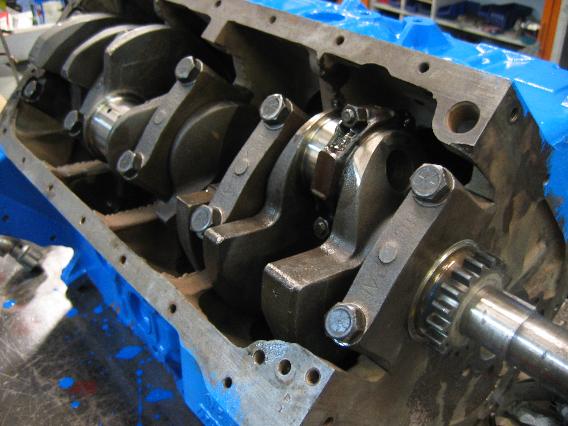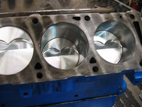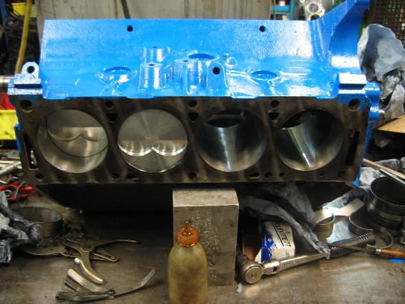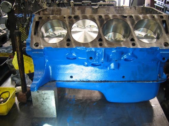 ...feinwuchten liessen und dann alles neu gelagert (CLEVITE + SEAL PRO) in den auf .040“ aufgebohrten und mit dem korrekten Laufspiel versehenen (sehr wichtig bei Schmiedekolben zur Vermeidung von Kolbenklemmern!) FE-Block installierten.
