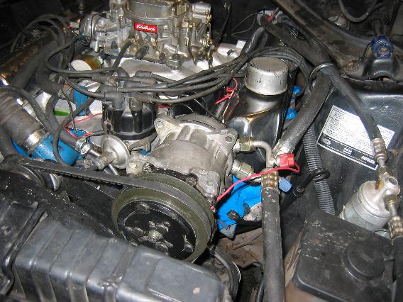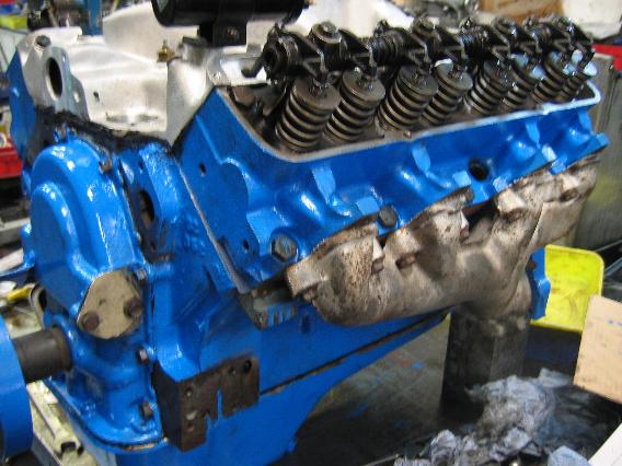 Auf dem folgenden Foto ist die montierte Edelbrock Performer Ansaugspinne deutlich zu sehen und die wegen besserer Alltagstauglickeit wieder verwendeten, aber ebenfalls geporteten Guss-Auslasskrümmer: